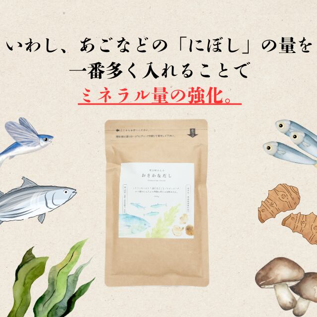 原材料名:いわし煮干し(四国産)、焼きトビウオ(長崎産)、カツオの節(鹿児島産)、乾椎茸(九州)、昆布(北海道産)、乾燥菊芋(静岡産)