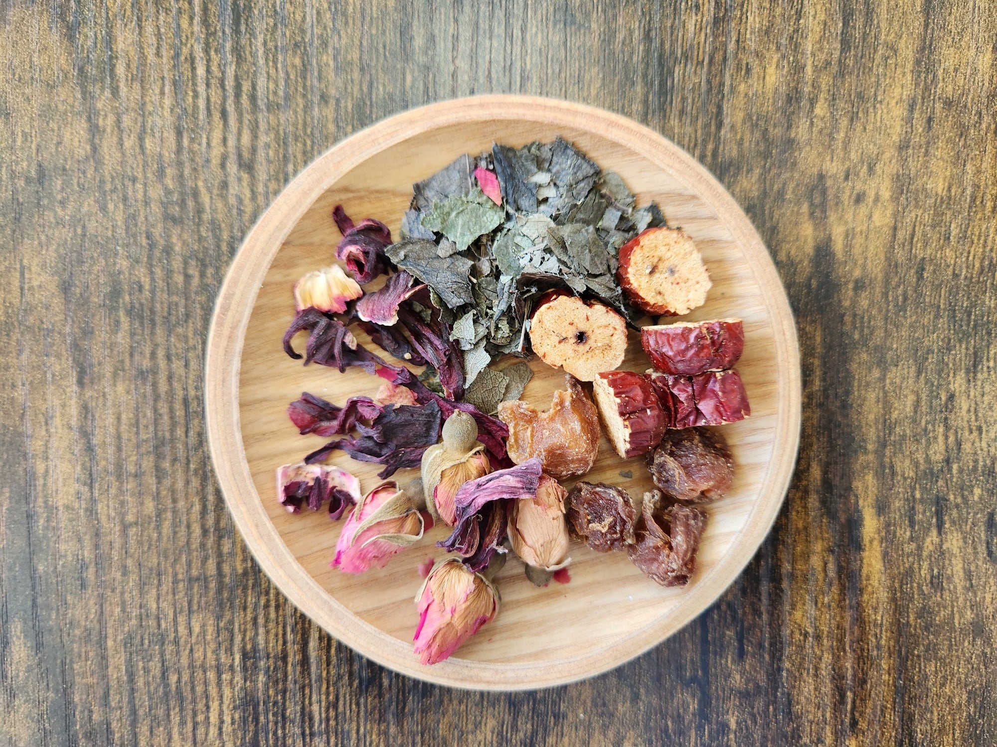 ハイビスカスをベースに、ローズ、リュウガンニク、なつめを配合しました。